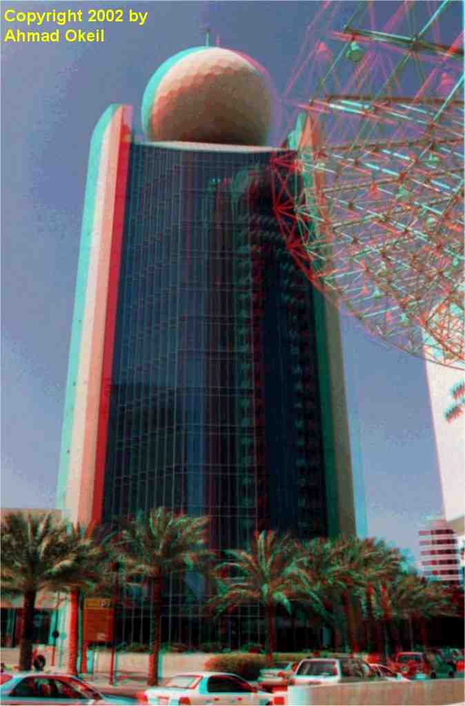 Colored anaglyph images maintain RGB information of objects in the scene. Colored anaglyph images offer an interesting alternative to gray scale anaglyph images as long as the original images do not contain neither red nor blue objects or backgrounds. The wind tower below is a good example of a colored anaglyph. Red or blue areas such as the red geodesic dome or the blue sky back ground shown below reach only one eye which causes a lot of confusion and spoils the stereoscopic effect.
