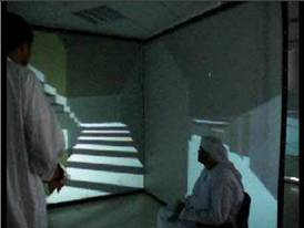 The first CAVE (as well as the concept) was created by the faculty, staff, and students at the Electronic Visualization Laboratory (EVL), University of Illinois in 1992 and displayed at SIGGRAPH 92. Since then this back-projection method of virtual reality has gained a strong following. The concept consists of a room with graphics projected from behind the walls. The images on the walls are usually in stereo to give a depth cue. The main advantage over ordinary graphics systems is that the users are surrounded by the projected images, which means that the images are the users' main field of vision. This is usually called a "CAVE", CAVE Automatic Virtual Environment. It has obvious benefits: it is easy for several people to be in the room simultaneously and therefore see images together; and it is easy to mix real and virtual objects in the same environment. Also, because users see for example their own hands and feet as part of the virtual world, they get a heightened sense of being inside that world. People in the field believe that 100-140 CAVEs were built worldwide. An incomplete list of CAVES could be found at http://www.ncsa.uiuc.edu/VR/cavernus/users.html |